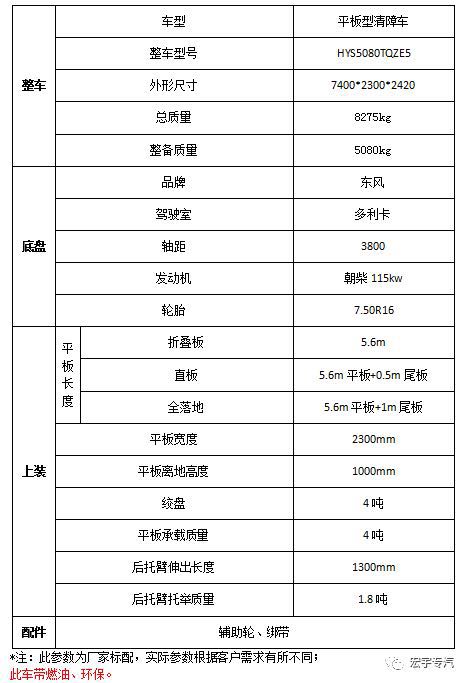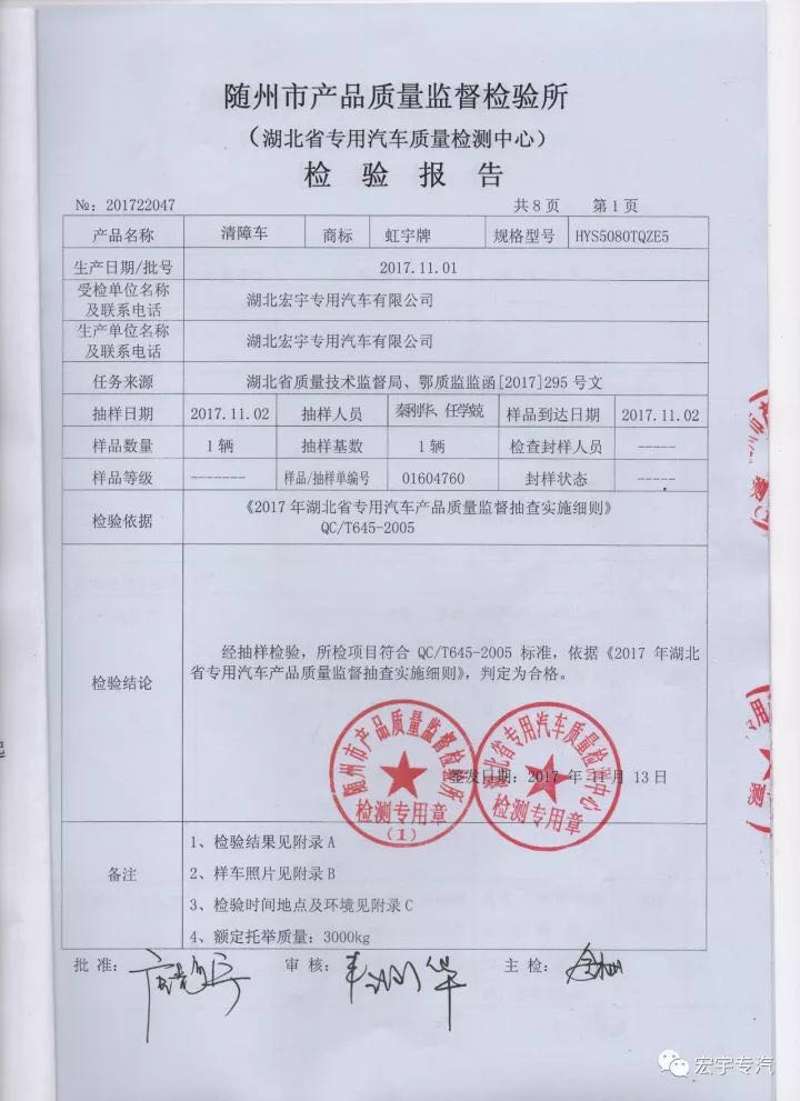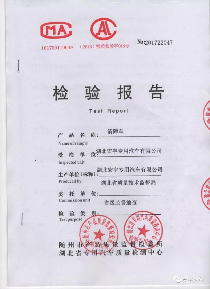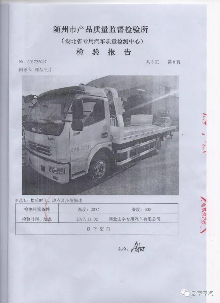 2017年11月2日,湖北省质量技术监督局联合随州市产品质量检疫所,对虹宇牌清障车进行了质量监督抽查。此次的抽查样本为虹宇牌HYS5080TQZE5型清障车,该款车型是基于东风底盘改装而成一拖二平板型清障车(底盘型号:EQ1080SJ8BDC、轴距:3800mm),能同时完成对两台事故车辆的清障救援。