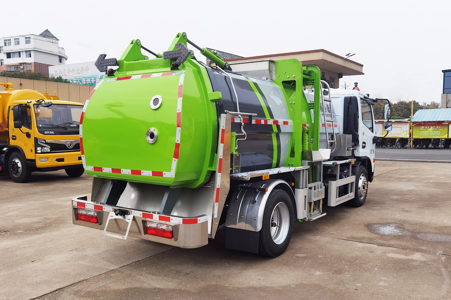 3.车身右侧配备液压双链条式提升机,加粗油缸,侧挂标准120L/240L塑料垃圾桶;