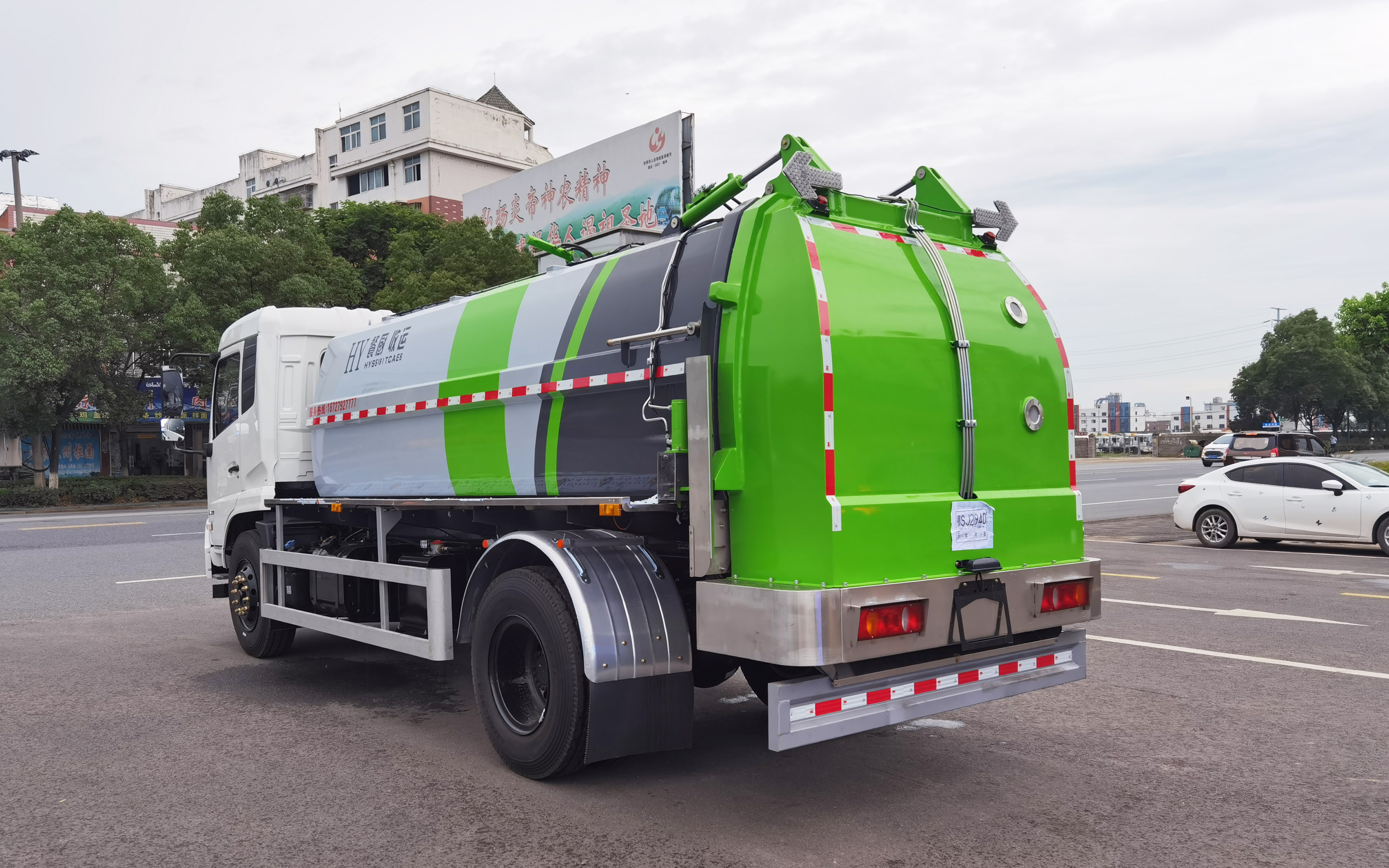 3.车身右侧配备液压双链条式提升机,加粗油缸,侧挂标准120L/240L塑料垃圾桶;