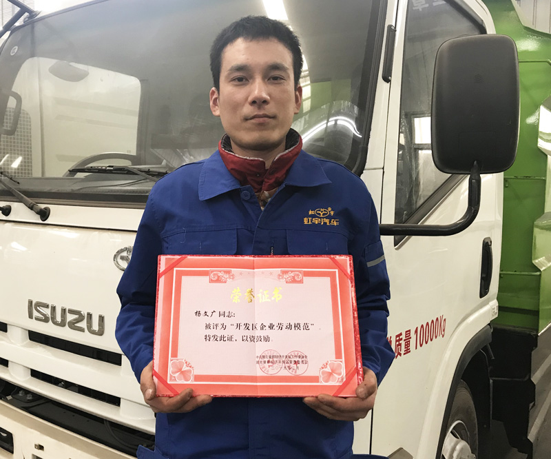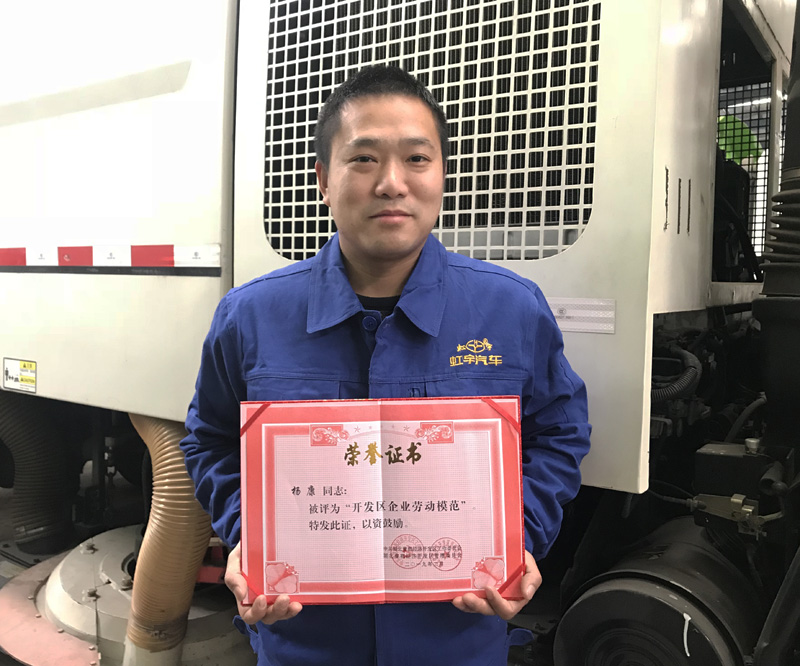 杨康,男,汉族,1986年出生,现在我公司售后服务部工作。今年是杨康同志在虹宇汽车工作的第11个年头了,从最初的车间焊装一线、到装配调试、再到现在的售后服务,杨康同志在每一个岗位上不仅工作技能突出,而且兢兢业业,任劳任怨。2018年,虹宇汽车流动服务站全面启动,杨康同志主动提出转岗至公司售后服务部,全国各省市间流转,致力为用户提供最迅捷的售后服务。从事售后服务工作,就意味着几乎全年时间都不在家,跟妻儿聚少离多。但杨康同志无悔自己的选择,他说作为公司的老员工,越是在艰苦的工作面前,越是应该最先站出来!